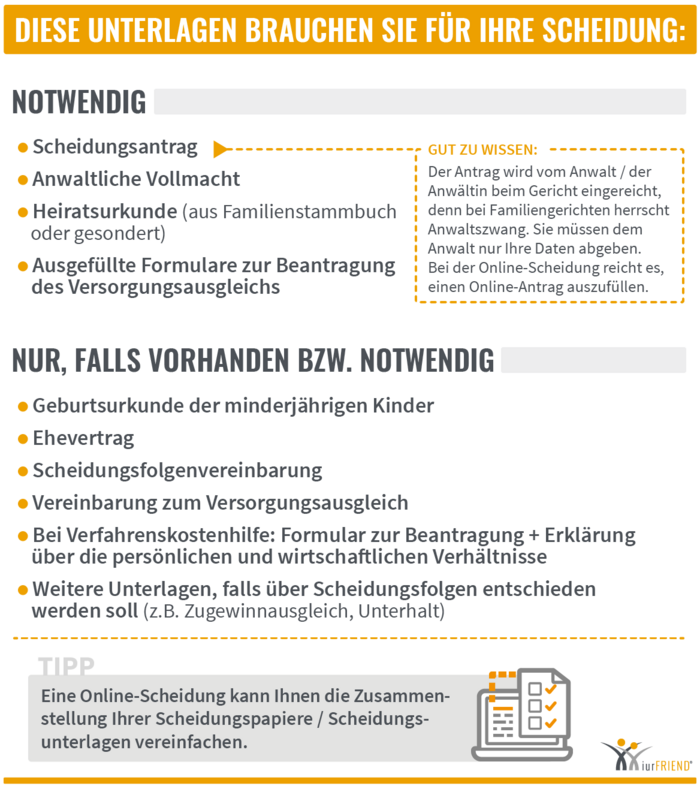 Dies bedeutet, dass im Scheidungsantrag der Vorname und der Familienname anzugeben ist. Tragen Sie einen zweiten Vornamen, sollte auch der zweite Vorname angegeben werden. Dies gilt ebenso für Namenszusätze (von/van, Freiherr), nicht jedoch für akademische Titel (Dr., Prof.).